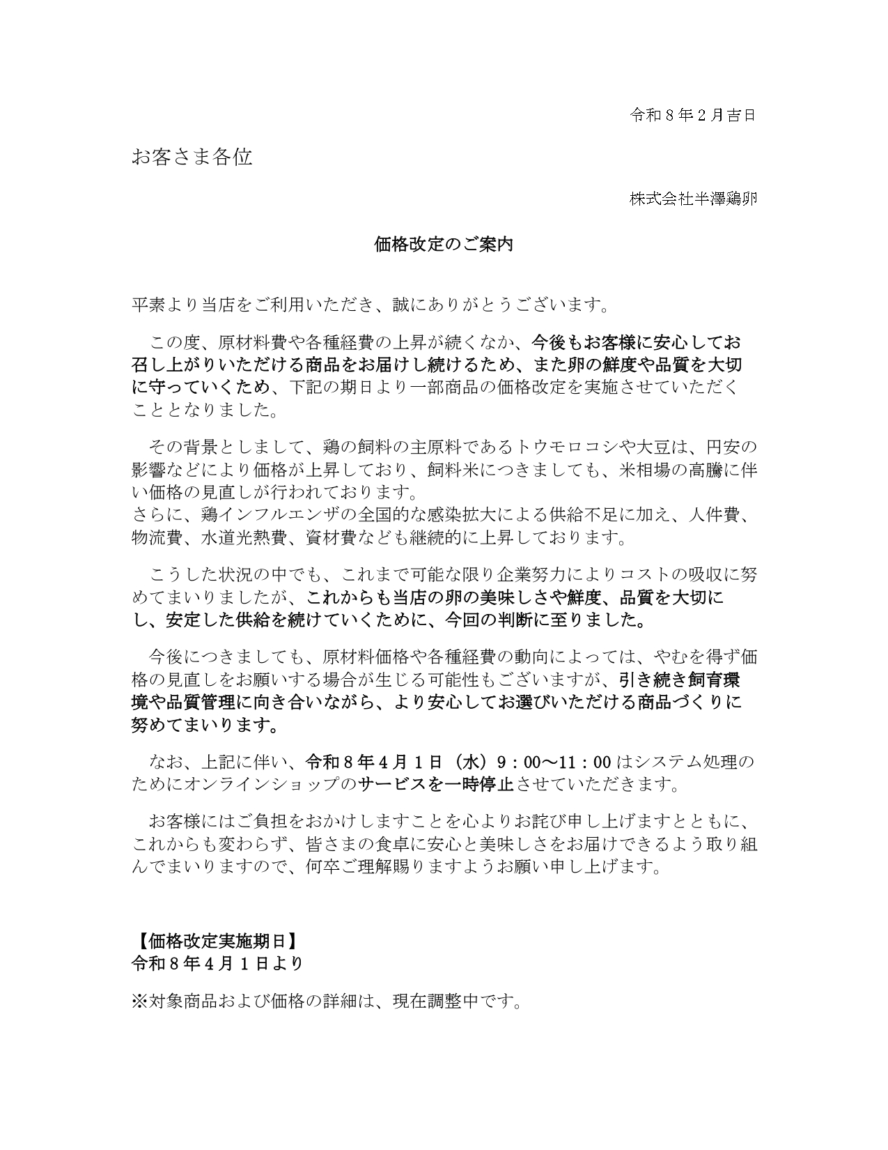 つきましては、誠に勝手ながら令和8年4月1日より対象商品の価格改定を